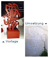 Links im Bild das Original (eine Skulptur des spanischen Künstlers Cesar Manrique) und rechts die Nachbildung in einer Aufputztechnik an der Hausfassade der beiden Lanzarote-Urlauber.